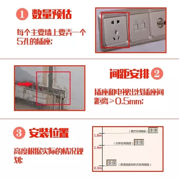 客廳與臥室的插座,應保證每個主要墻面均有一個5孔插座,以滿足日常生活所需。插座的位置應根據(jù)房屋的設計來確定,如電視背景墻位置的插座可適當多一些,其他位置的根據(jù)需要而定。