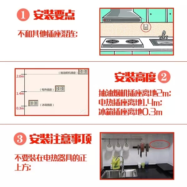 廚房應根據(jù)建筑裝修的布置,在不同的位置、高度設置多處電源插座以滿足抽油煙機、消毒柜、微波爐、電飯煲、電熱水器、電冰箱等多種電炊具設備的需要。