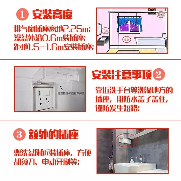 安裝在衛(wèi)生間的插座宜帶開關和指示燈,如果安裝在潮濕位置的插座,好在插座表面安裝一個防水的蓋子,避免水汽進入插座內,引起短路。