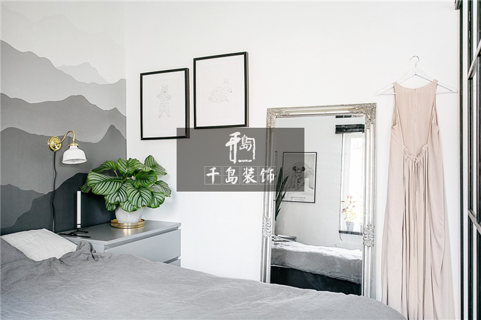 無論是灰白黑等冷色調(diào)的運(yùn)用,還是大片的空間留白,臥室內(nèi)部更多地還是彰顯出濃郁的北歐風(fēng)情。但巧妙地將色澤變化運(yùn)用其中,墻壁一面由深及淺的灰色增加了空間的層次感,另一面用黑框裝飾畫強(qiáng)調(diào)北歐風(fēng)主題,其中金屬壁燈的點(diǎn)綴便不顯突兀又獨(dú)具魅力了。
