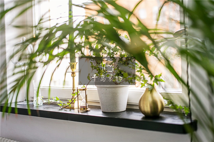 臥室的窗臺(tái)處照樣運(yùn)用了大量的綠植加以點(diǎn)綴,為空間增加了一分生機(jī)。但其中零星點(diǎn)綴的金屬擺件卻是和綠植相輔相成,不會(huì)太過冰冷,亦不會(huì)太過柔和,既豐富了混搭空間的主題,又增加了些許居家的品質(zhì),一舉兩得。