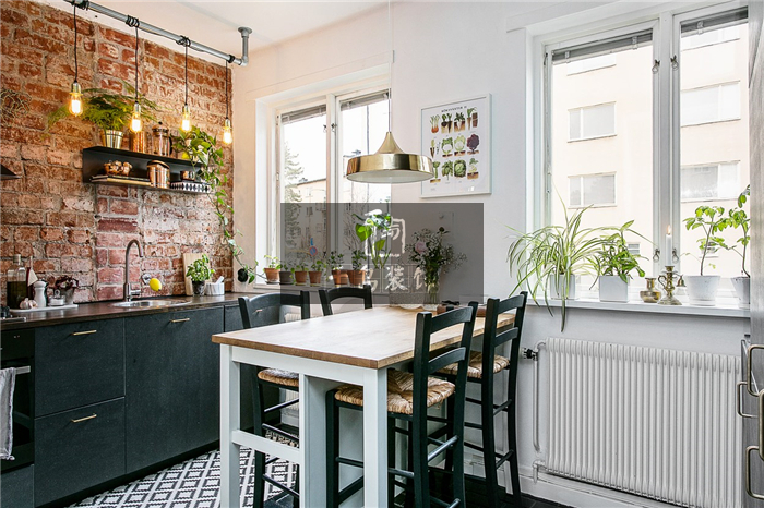 客廳的另一側(cè)直接通往用餐區(qū)域。相比較為淡雅簡(jiǎn)潔的客廳,餐廳主要運(yùn)用的黑色調(diào),從過道的黑色磚過渡到吧臺(tái)位置的黑白磚,由上又利用紅色磚墻過渡,搭配頂部的金屬橫桿及魚線型工業(yè)吊燈,帶來酷炫而稍顯復(fù)古的工業(yè)風(fēng)。