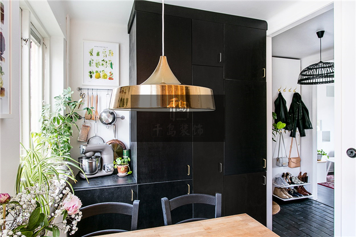 用餐區(qū)域仍然選擇了工業(yè)風(fēng)十足的金屬吊燈,寬大的燈罩豐富了空間,但纖細(xì)的燈線卻不會(huì)讓頂部顯得過于壓抑。且餐桌及餐椅則都選用了實(shí)木材質(zhì),與有著窗戶的那面白墻相互照應(yīng),僅僅用一面裝飾畫、幾株綠植便帶來充滿自然氣息的北歐風(fēng)情,瞬間柔和了用餐的氛圍。