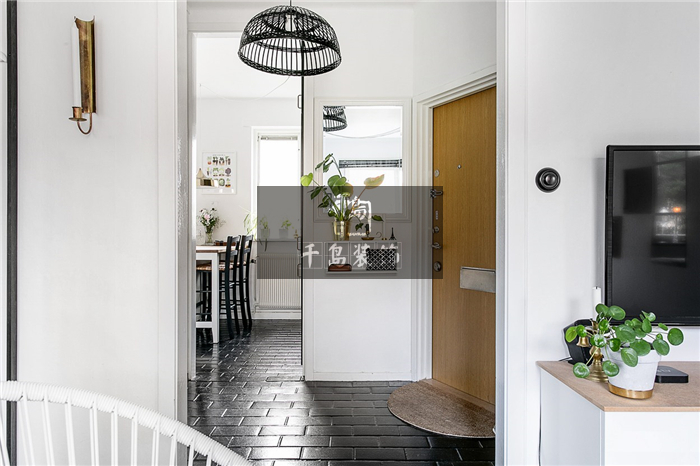 浴室在餐廳與客廳之間,為了避免中間的通道過于單調(diào),屋主在頂部設(shè)計(jì)了一盞鐵藝吊燈,寬大的燈罩搭配鏤空的線條,能夠恰到好處地充盈空間,又不會(huì)顯得過于笨重。純黑的色澤與黑色磚面相互映照,又與白色墻面相互對(duì)比,無處不產(chǎn)生碰撞的美感。