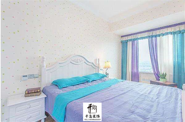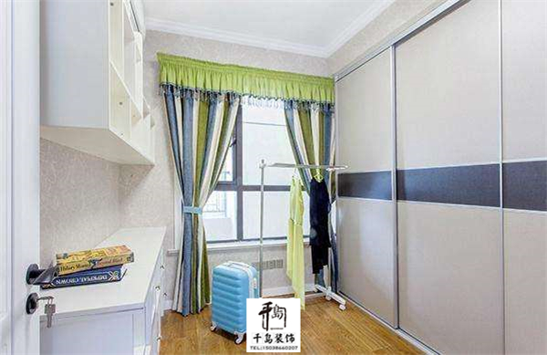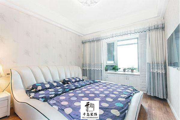 次臥,裝修的很簡(jiǎn)單,有一種小清新的感覺(jué),帶著一個(gè)飄窗,窗簾和床上四件套的顏色是一樣的。