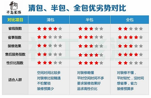 裝修前首先要搞清楚幾個(gè)裝修形式的概念,清包、半包、全包還有現(xiàn)在的主流整裝概念。每件事都各有它的兩面或者多面性,利或弊,好或壞。清包很省錢,全包很省力,半包則介于兩者之間,這也是為什么很多人會(huì)選擇半包的主要原因。