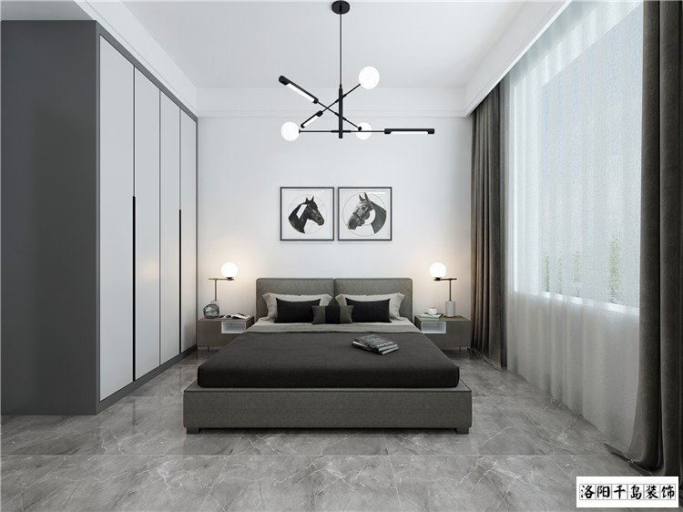 主臥采用典型的黑白灰裝修風(fēng)格,白色整體定制衣柜,滿滿的高級感,床頭硬包簡約大方,配上金色的金屬燈具,效果不要太贊了!