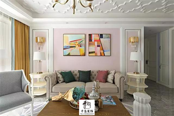 進(jìn)入客廳是淡粉色的墻面,搭配金色的窗簾,以及幾何的裝飾畫,來點(diǎn)綴空間從而使空間的色調(diào)更加的豐富。