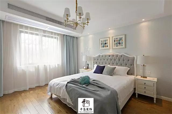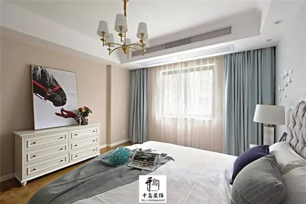 主臥的設(shè)計(jì)繼續(xù)延續(xù)素雅,這樣的睡眠空間更好的入睡。馬頭的裝飾畫為空間營造出一份藝術(shù)的氛圍。