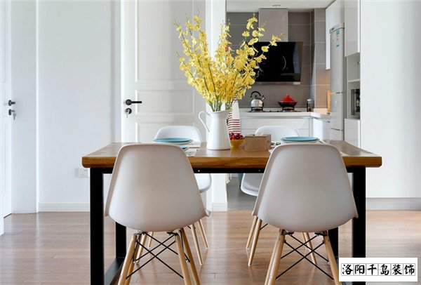 餐廳的空間不大,在廚房與客廳的過渡區(qū),硬裝為白色的墻面,原木色的地板,與整體風(fēng)格契合,既樸實又簡潔。餐桌選用非常經(jīng)典的北歐風(fēng)格,不刻意修飾的桌面板材,配上粗壯的鐵藝腿部支撐,兼具了時尚和工業(yè)風(fēng)的格調(diào),再配上造型前衛(wèi)的休閑椅,令這個空間雖然簡單卻不孤單。桌面用陶瓷花瓶,配上鮮艷的仿真絹花裝點,給這塊空間帶來明媚的色彩。