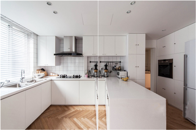 地面使用瓷磚雖然是老規(guī)矩,但是它看起來很冷硬,所以這個廚房使用小白磚加原木地板的硬裝,增加了廚房空的親切感,看起來也更舒服。