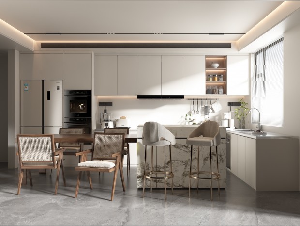 啞光材料的使用能帶來(lái)質(zhì)感與高級(jí)感的提升。選擇色調(diào)細(xì)膩的啞光材料,尤其地面和柜門位置,使裝修更加耐看,創(chuàng)造出令人心馳神往的高級(jí)效果。