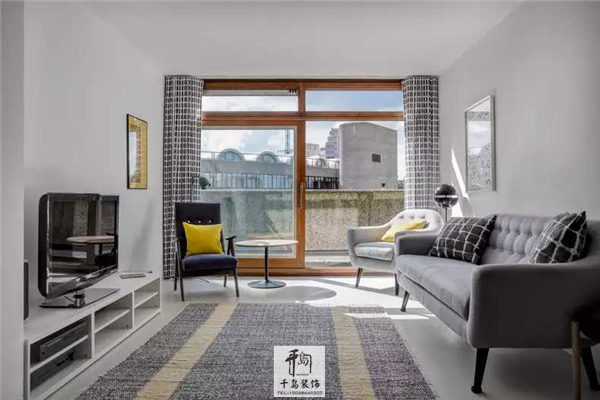 客廳的家具、布藝材質(zhì)都是灰白系的淡雅色調(diào),布藝上的格子印花增添紋理感,點綴色彩的巧妙做法是靛藍色與淺灰色單人沙發(fā)上,各放了一個檸檬黃的枕頭,使這片淺色調(diào)區(qū)域有了視覺焦點。