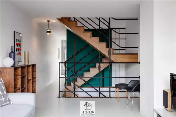 采光條件較差的樓梯空間,墻面被刷上了青綠色,進一步凸顯出棕木色樓梯的原木質(zhì)感,并在黑色扶手與白色墻面之間起到了過渡作用。美美的墻邊柜空間也少不了小清新色彩裝飾畫的點綴。