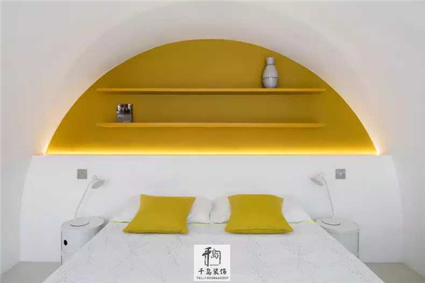 以白色為主色的筒形拱頂臥室,芥末黃的枕頭和墻面還有置物架,都為這個休息空間增添了許多的生氣。
