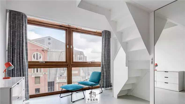 在二樓的落地窗旁,如此充滿陽光與詩意的角落,當(dāng)然得放上舒適的躺椅,愜意得享受窗外景色和陽光啦!柜子上的臺燈和躺椅更是組成了紅藍色彩CP~