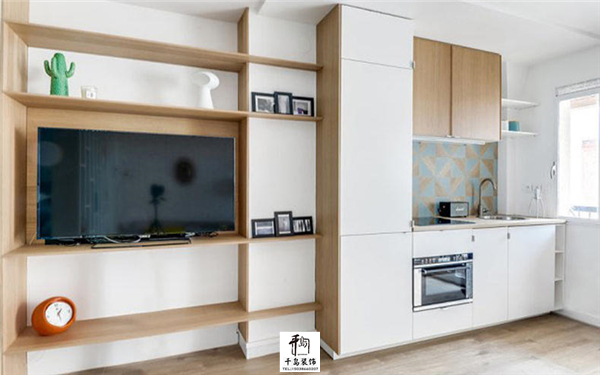 單獨(dú)的看一下這面墻,我覺得這人能夠利用墻壁裝出這樣的效果,也真是夠有才,這面墻壁不僅是電視墻,也是打造了入墻式的櫥柜,中間做了一個隔斷設(shè)計,小小的櫥柜確是我們的開放式廚房,對于這種小戶型而言,這樣的設(shè)計很省空間,而且格局設(shè)計我覺得給滿分。
