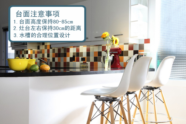 廚房的臺面設計通常會選擇人造石或者大理石等等石材,工作臺面高度必須在80-85cm之間,這點是廚房裝修注意事項中容易被忽略的地方。灶臺的左右設計與墻面的距離在30cm左右。管道設計時要考慮抄表的方便性問題,上下水管道與水槽相對應。