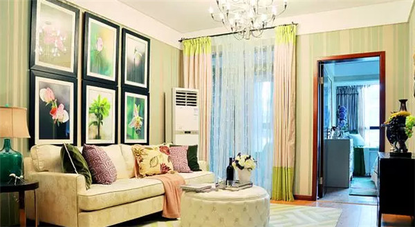 把自己的攝影作品加入自家的墻面裝飾,以花為主題,貫穿家的整體搭配,經(jīng)濟(jì)又獨(dú)特.墻紙的顏色跟窗簾地毯進(jìn)行呼應(yīng),一個(gè)綠意濃濃的客廳溫馨又舒適。