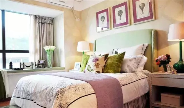抹茶綠的軟包床搭配薰衣草紫的床品和掛畫,用淺米色墻紙鋪墊,淡淡的花香縈繞臥室,不想睡個(gè)好覺(jué)都難。